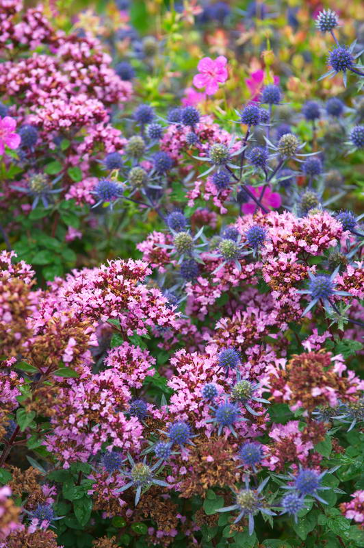 - Origanum laevigatum 'Rosenkuppel', Eryngium tripartitum, Garten-Edeldistel