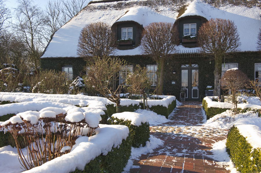Haus, Hecken, Pflaster, Reetdach, Schnee, Weg, Garten Christine Eichner
