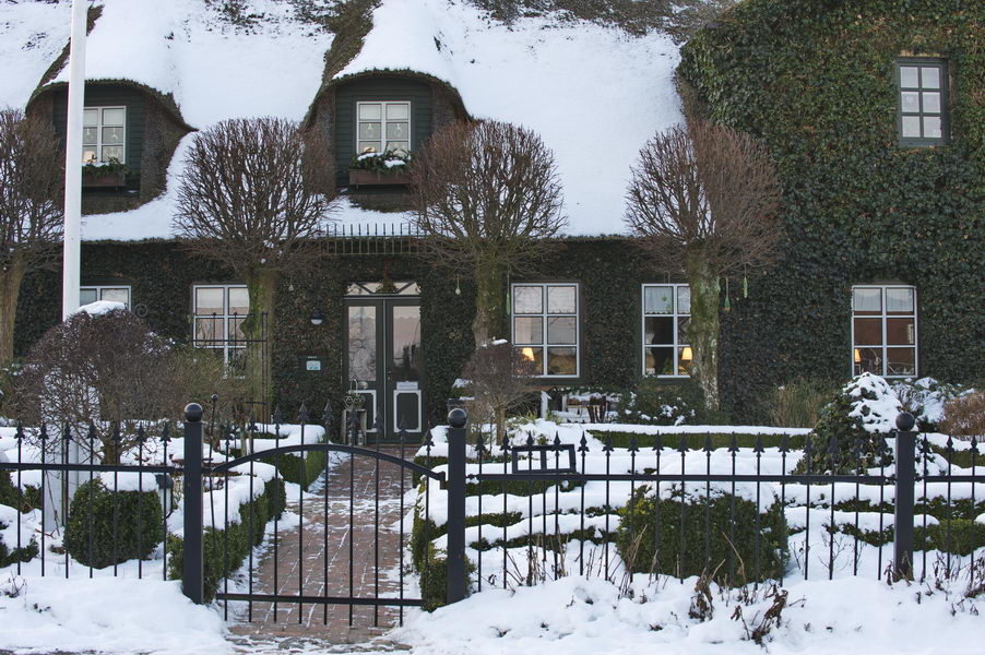 - Garten Christine Eichner, Haus, Reetdach, Schnee