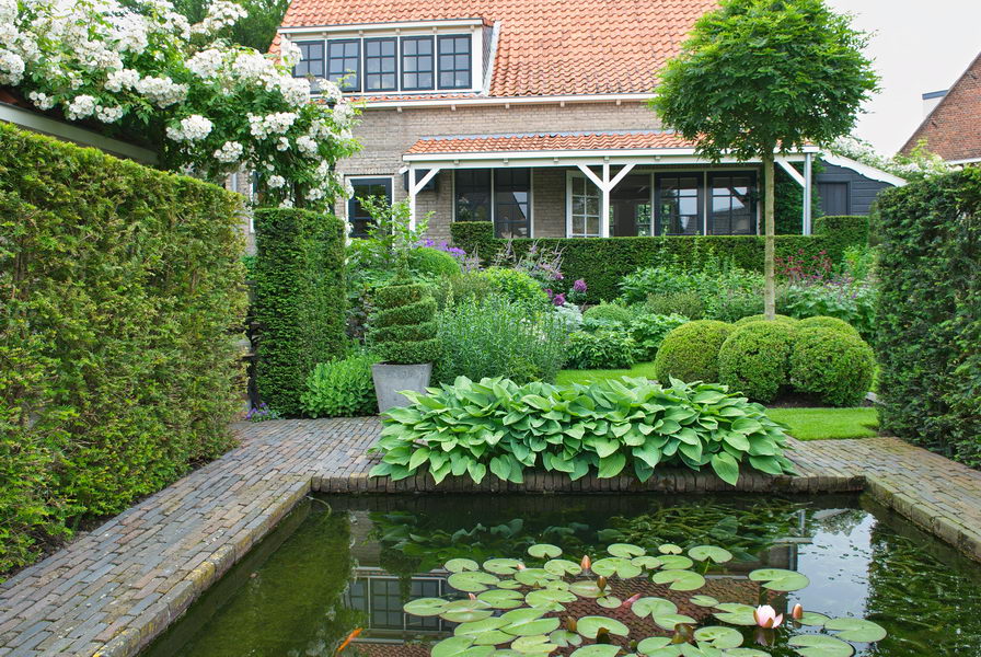 - Haus, Hecke, Hosta, Seerose, Sichtschutz, Teich, Wasser