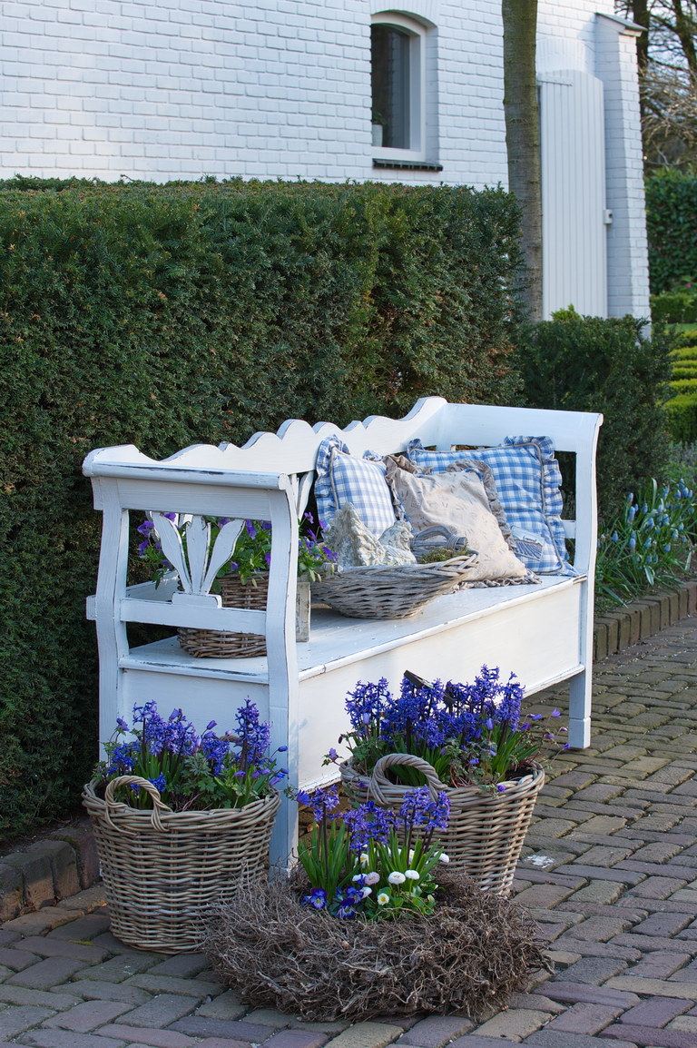 Bank, Gartenbank weiß, Hecke