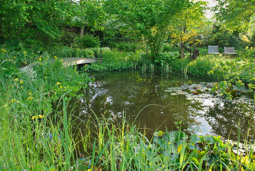 - Iris pseudacorus, Steg, Naturgarten, Teich