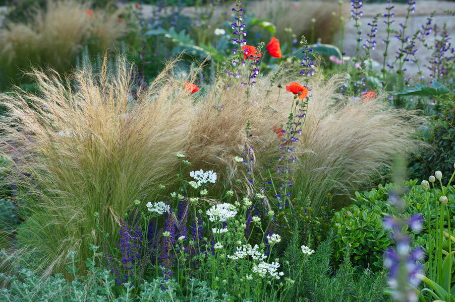 - Mohn, Naturgarten, Papaver rhoeas, Salvia ‘Madelaine’, Stipa, Stipa tenuissima