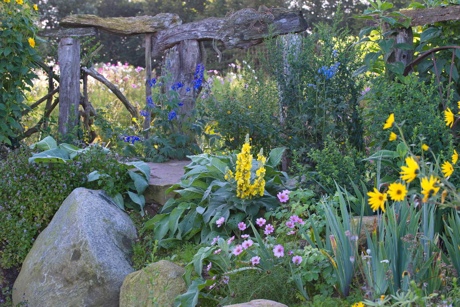 - Cosmea, Delphinium, Findling, Holz, Naturgarten, Verbascum, Totholz