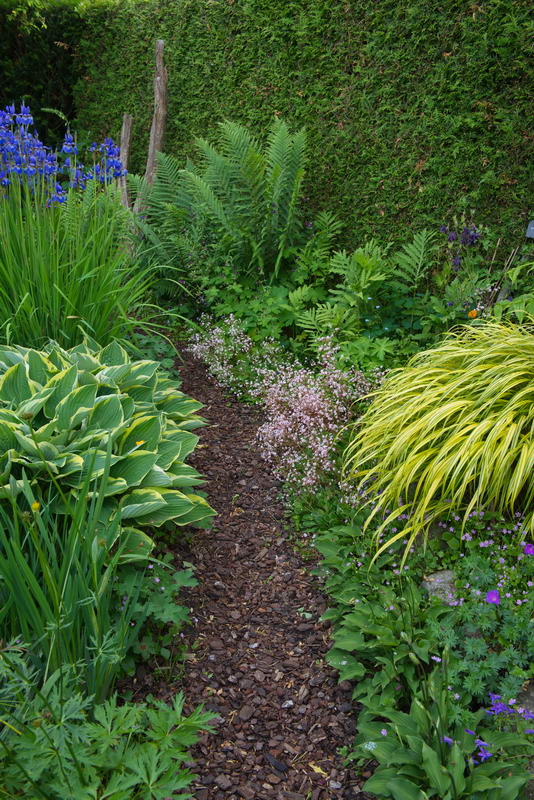 Hakenochloa macra "Aureola", Mulch, Pfad, Hosta, Schatten, Farn, Brenning