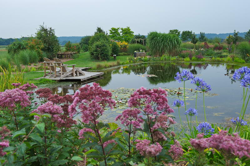 Holzdeck, Lärche, Teich, Eupatorium, Tuin de Villa