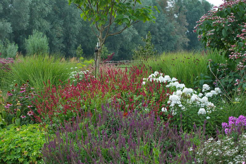 - Clerodendron trichotomum, Gräser, Knöterich, Persicaria amplexicaule, Phlox, Bistorta amplexicaule, Tuin de Villa