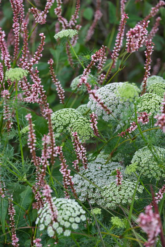 - Ammi visnaga, Bischofskraut, Bistorta amplexicaule 'Rosea', Knöterich, Persicaria amplexicaule 'Rosea', Tuin de Villa