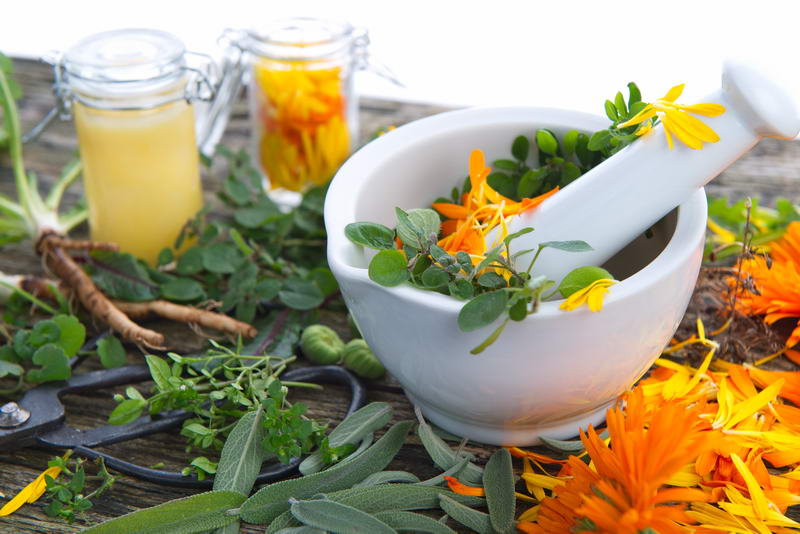- Calendula, Kräuter, Mörser, Ringelblume, Salbei, Salvia, Stellaria media, Vogelmiere, Oregano