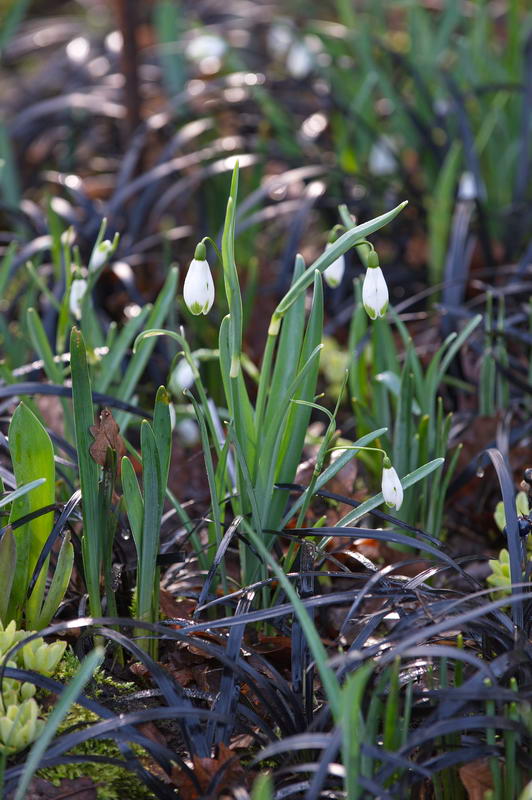 - Galanthus 'Viridapice', Ophiopogon planiscapus 'Niger', Schneeglöckchen, schwarzer Schlangenbart